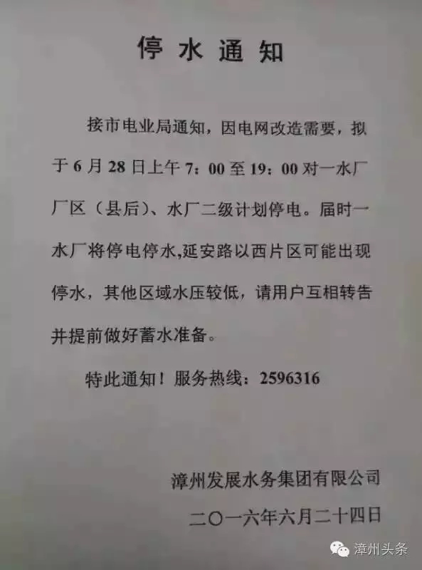 根據漳州市電業(yè)局通知,因電網改造需要,6月28日上午7:00至19:00,將對漳州一水廠廠區(qū)(縣后)、水廠二級計劃停電。屆時,一水廠將停電停水,延安路以西片區(qū)可能出現停水,其他區(qū)域水壓較低,請用戶互相轉告并提前做好蓄水準備。
